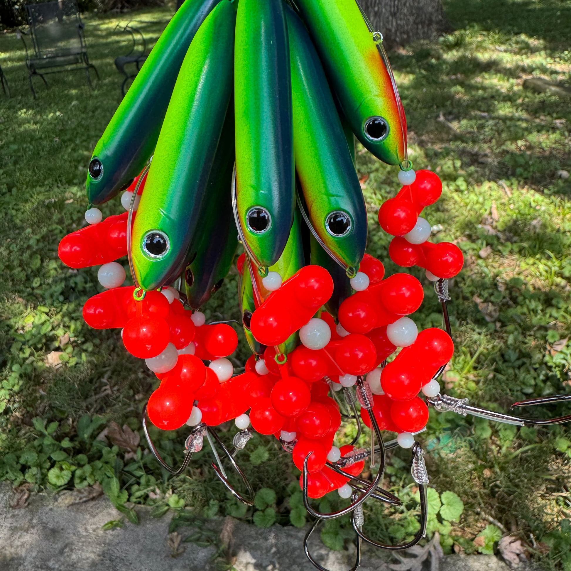 What sets these rigs apart are the hand-painted bait floats, each uniquely detailed to enhance visibility and mimic natural prey while adding an artisan touch to your spread. Brightly finished beads and durable crimps complete the setup, making the rigs both highly effective and eye-catching in the water.